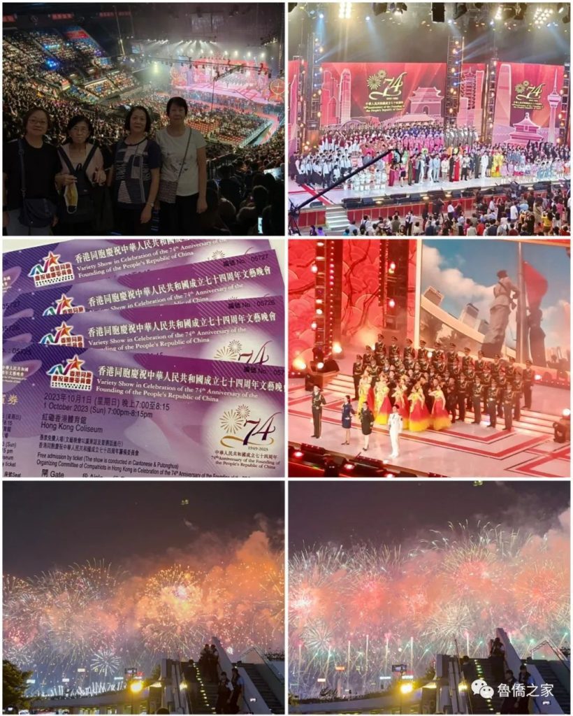 10月1日,香港同胞慶祝中華人民共和國成立74周年文藝晚會在紅磡體育館拉開帷幕。全國政協副主席梁振英、香港特區行政長官李家超、中央政府駐港聯絡辦主任鄭雁雄、中央駐港國安公署副署長孫青野、外交公署署理特派員李永勝、解放軍駐港部隊副政治委員王兆兵等出席。同日,香港闊別5年的國慶煙花匯演,在維港上空再次綻放。香港特區行政長官李家超、中央政府駐港聯絡辦主任鄭雁雄等在會展中心主持煙花匯演啟動禮。香港山東僑界聯合會組織會員義工觀看了國慶文藝晚會及煙花匯演。